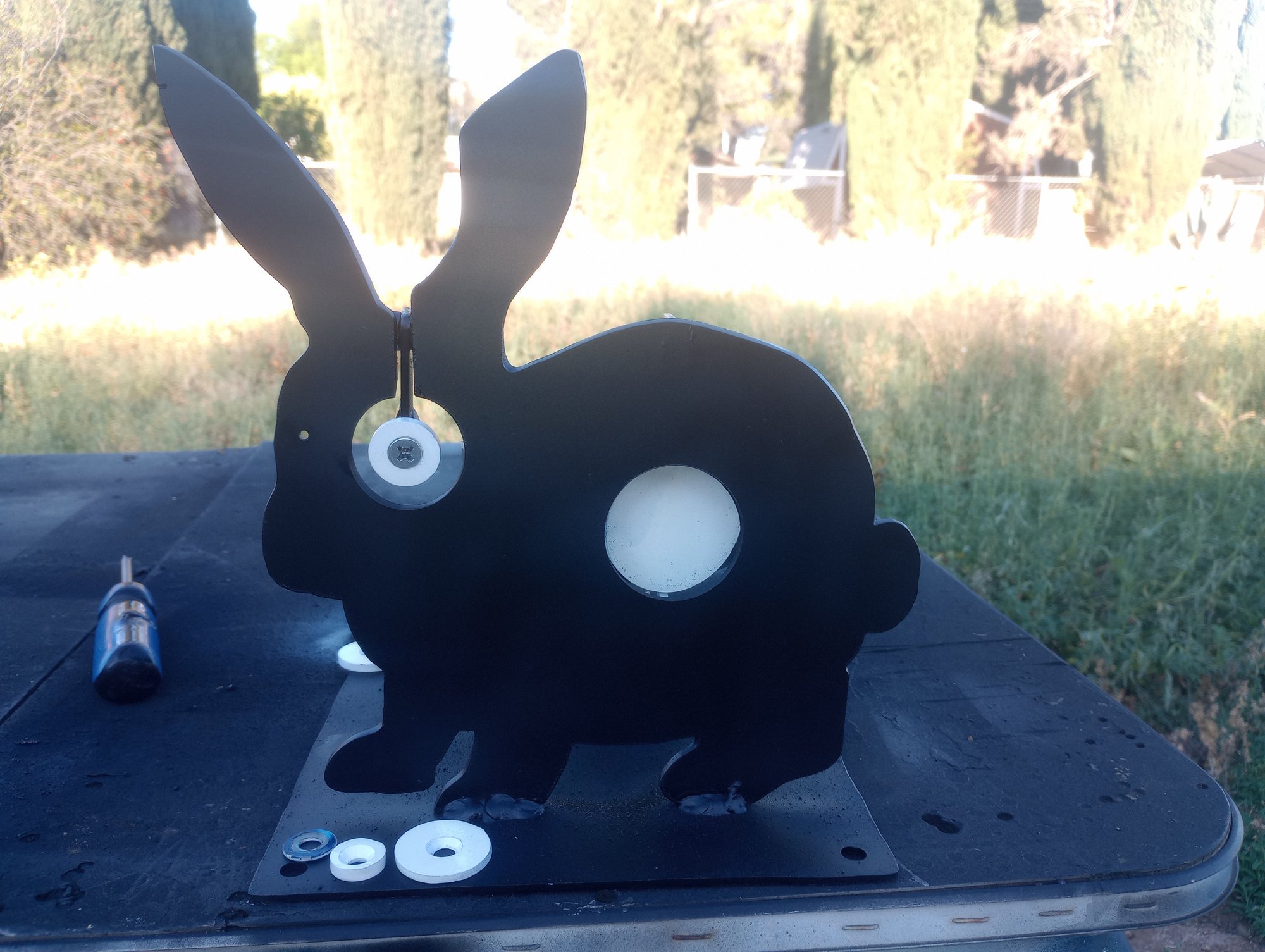 the rabbit bell is a medium size target with are replaceable paddles. the paddle sizes are 3/4 and 7/8 and 1 inch. kill zone for the bell come in 1 inch, 1- 1/4 inch, 1- 1/2 inch, and 2 inch.
